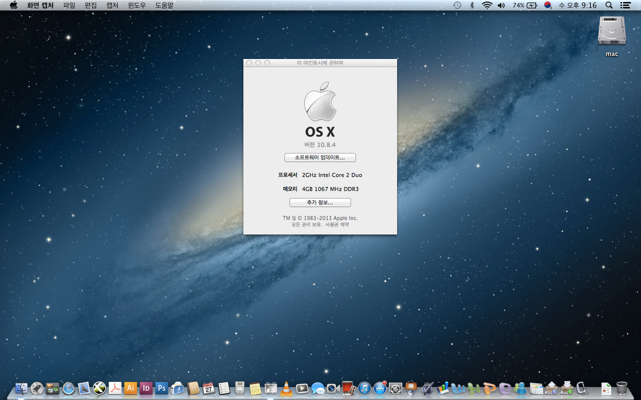 맥은 안정적인 OS인 10.8.4 설치됨