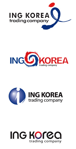 색감이 이쁘요^^.. 1. 붓터치길이감이 좀 통통한거같아요.. 터치의 동그한형태가 좀 타원형으로 좀더 좌우로 삐딱해지게.. 그러면 공간감이 더 생길꺼같은데... 2.아이엔지 코리아서체가 좀 부드러웠으면 어떨까하네요.. 휘모리붓터치^^..의 꼬리들도 좀 정리되면 좋을꺼같고요^^.. 3.트레이딩 로고체를 가늘고 좀더 작게^^.. 4.4번이 제일 맘에 들어요..특히 색이 교차하는 보분^^.. 트레이딩을 좀더 작고 가늘게..고딕적으로^^.. 근데..무역회사인가요??? 많이 배우고 갑니다^^..