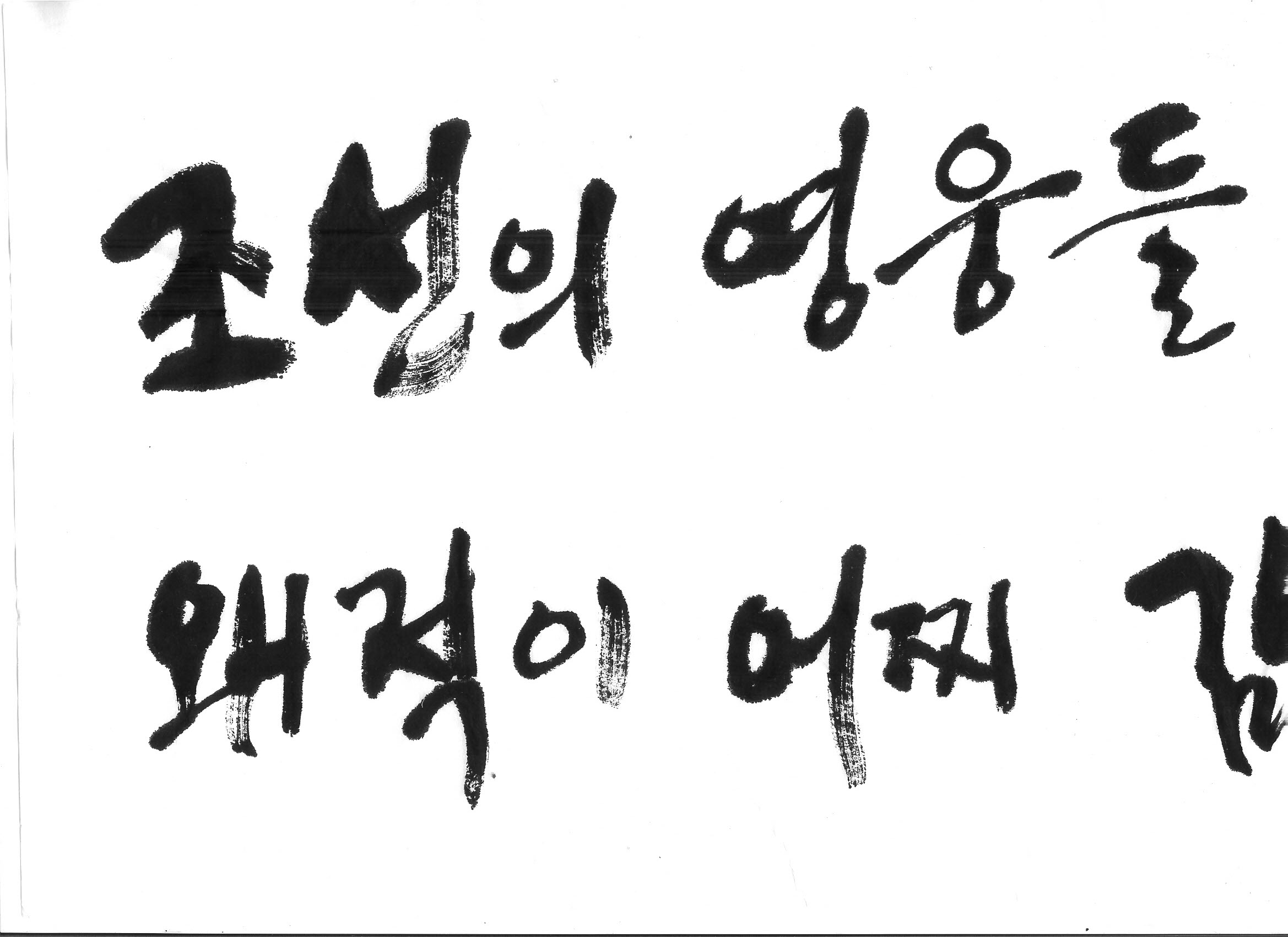 힘찬 캘리 부탁합니다. 김철호 일반 0 13703 2008.09.22 00:49 > > 조선의 영웅들, 천하에 당할 자 없으니 > > > 왜적이 어찌 감히 조선을 넘보리오 > > > > 이렇게 두 문장입니다. > 임진왜란을 주제로 한 캘리인데요. 염치없지만 부탁드려 볼꼐요. >