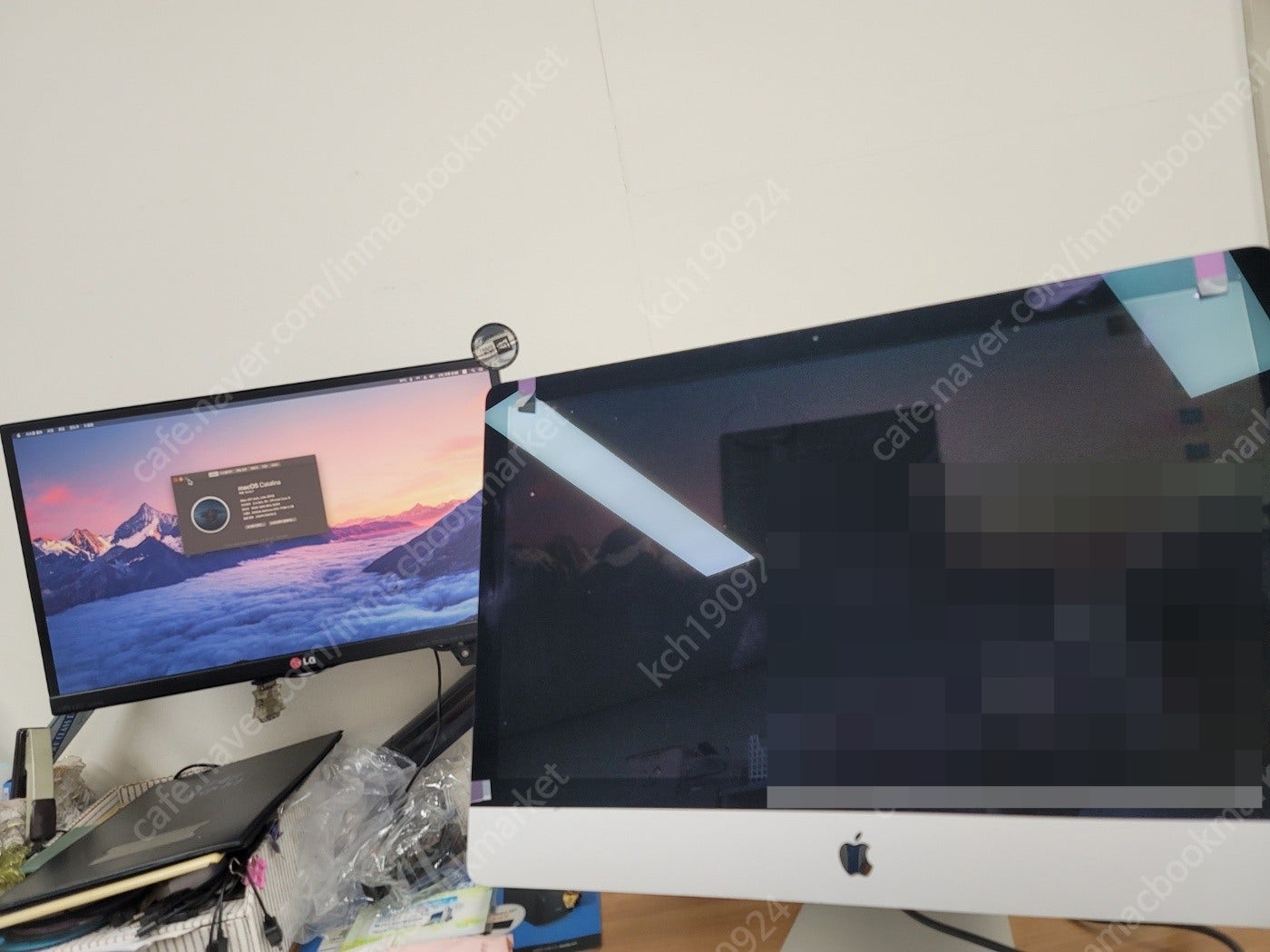 화면 강화유리 파손 있습니다. 전면 유리 파손이라서 사진처럼 화면 출력에는 문제 없구요. 뒷면에 테이프 흔적이 있는데 제거 가능합니다. 아이맥 단품에 전원케이블(일반,검정) 포함 입니다.